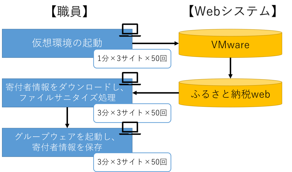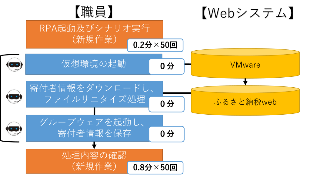 ふるさと納税に伴うWebサービスからのダウンロード、集計報告、傾向分析等の作業は年間数万件にも及びます。また、ふるさと納税を実施している他の自治体にも同じ作業が発生しているため、一度作成したシナリオをベースにすることで、導入コスト削減も見込めます。